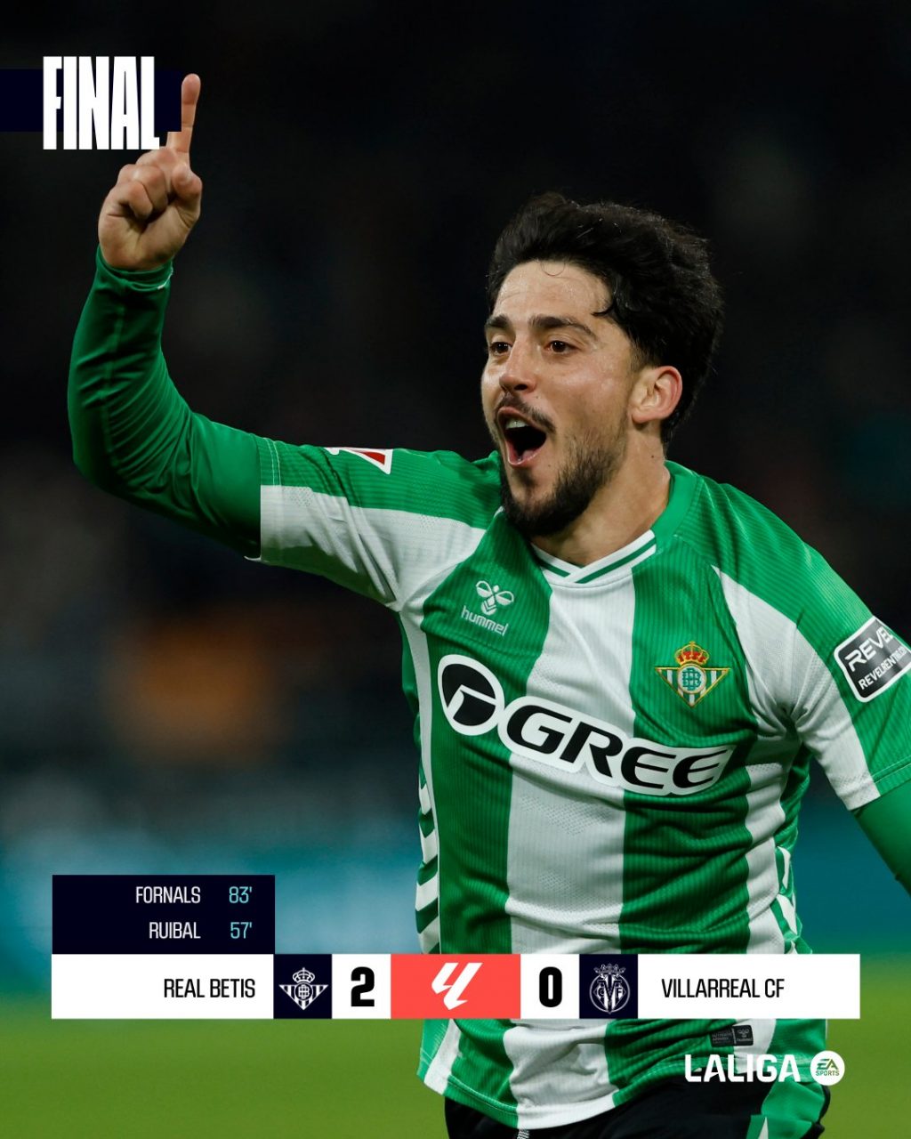 En el minuto 57, Ruibal recoge un balón que le envía Antony, que  no despeja con contundencia  Parejo y lo introduce en el fondo de la portería del Villarreal. El jugador bético se está convirtiendo en un referente en el equipo verdiblanco.