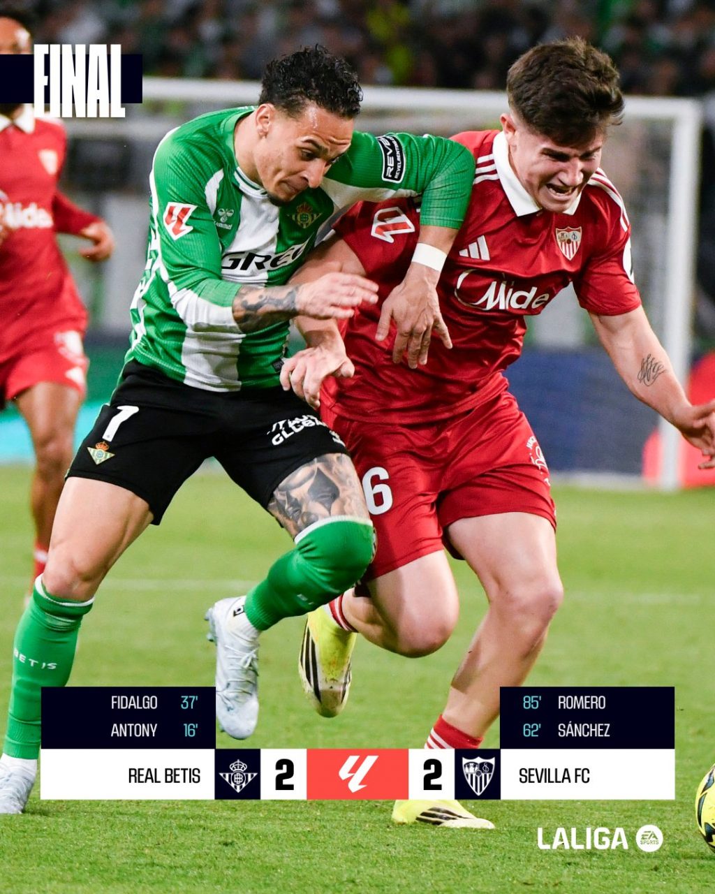 Con las espadas en todo lo alto y apenas treinta segundos por jugarse, el Betis veía cómo se le escapaba un derbi que tenía completamente controlado en la primera mitad. Finalmente, el encuentro concluyó con un empate que dejó sensaciones muy distintas: el Sevilla celebró la reacción y el Betis lamentó haber dejado escapar un triunfo que parecía asegurado.