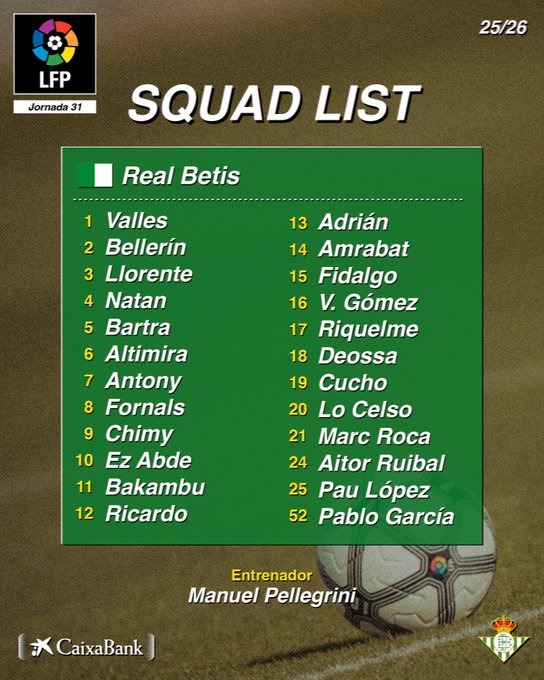 La convocatoria publicada por el club refleja un mensaje claro: Pellegrini quiere a todos enchufados. La lista de 24 jugadores citados combina experiencia, juventud y alternativas tácticas para un encuentro que exigirá piernas frescas y cabeza fría. Álvaro Valles, que apunta a recuperar la titularidad, encabeza una expedición en la que también figuran referentes como Bellerín, Bartra, Fornals, Amrabat, Lo Celso, Abde, Cucho Hernández o Bakambu, ya plenamente integrado en la dinámica del grupo.